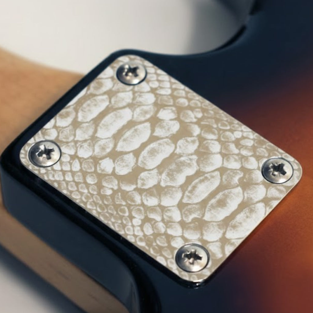 Product form Guitar neck plate - Snake skin - Fender size $48.00Incl. VAT Give a unique and original style to your guitar or bass guitar with this customised Neck plate. This plate has... NO BUNDLE BUNDLE - OPTION 1 BUNDLE - OPTION 2 Style NO BUNDLE BUNDLE - OPTION 1 BUNDLE - OPTION 2 10 products in stock. Worldwide shippingEU shipping time: 3-5 daysUS shipping time: 7-15 daysWorldwide: 7-15 days Add to cart Premium engraved neck plate with black and brass finish.All parts are meticulously engraved in our workshop in FranceWorldwide shipping order processed in 24 hrs Description Compatibility Reviews 0 reviews Pairs well with Share with your friends Share WhatsApp Deel X Pin it Messenger Email